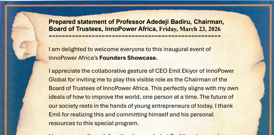 Read the Opening Speech by Professor Adedeji Badiru, Chairman, Board of Trustees, InnoPower Africa. Friday, March 23, 2026.